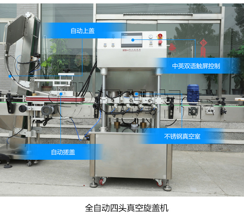 該生產(chǎn)線適合中小口徑三旋、四旋玻璃瓶調(diào)味醬的分裝,適合醬料、含顆粒黏稠物料的灌裝,物料接觸部分均采用316不銹鋼,整機(jī)304不銹鋼,符合食品衛(wèi)生標(biāo)準(zhǔn)。該機(jī)設(shè)計(jì)合理,機(jī)型小巧,立式結(jié)構(gòu),節(jié)省場(chǎng)地,操作方便。啟動(dòng)部分均采用FESTO和臺(tái)灣AirTack的氣動(dòng)元件。灌裝閥有氣動(dòng)閥控制,灌裝精度更高,灌裝量和灌裝速度均可任意調(diào)整,灌裝悶頭采用防拉絲及升降灌裝裝置。