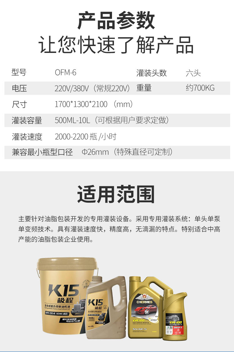全自動(dòng)六頭稱重潤(rùn)滑油灌裝機(jī)主要針對(duì)油脂包裝開(kāi)發(fā)的專用灌裝設(shè)備。采用專用灌裝系統(tǒng):?jiǎn)晤^單泵單變頻技術(shù)。具有灌裝速度快