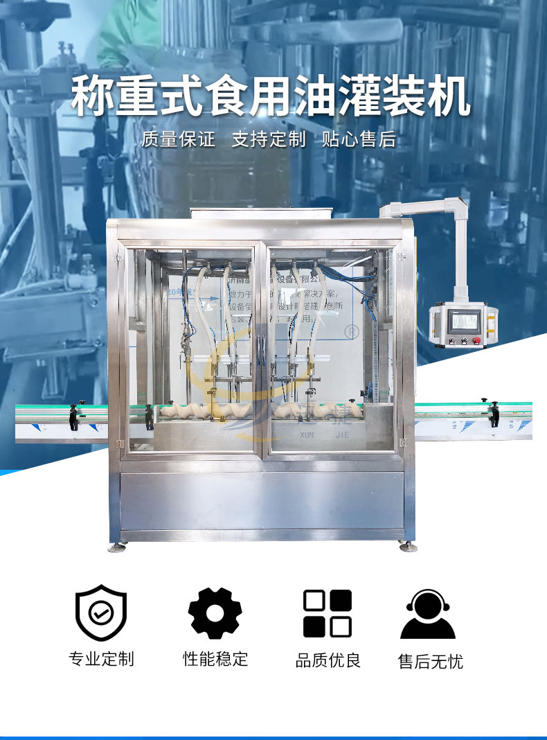 全自動食用油灌裝機適用于玻璃瓶、PET瓶、PP桶都可以灌裝。包裝規(guī)格:500ml、900ml1.6L、4L、5L、8L、10L、18L。