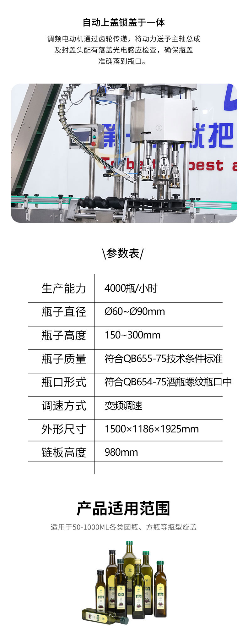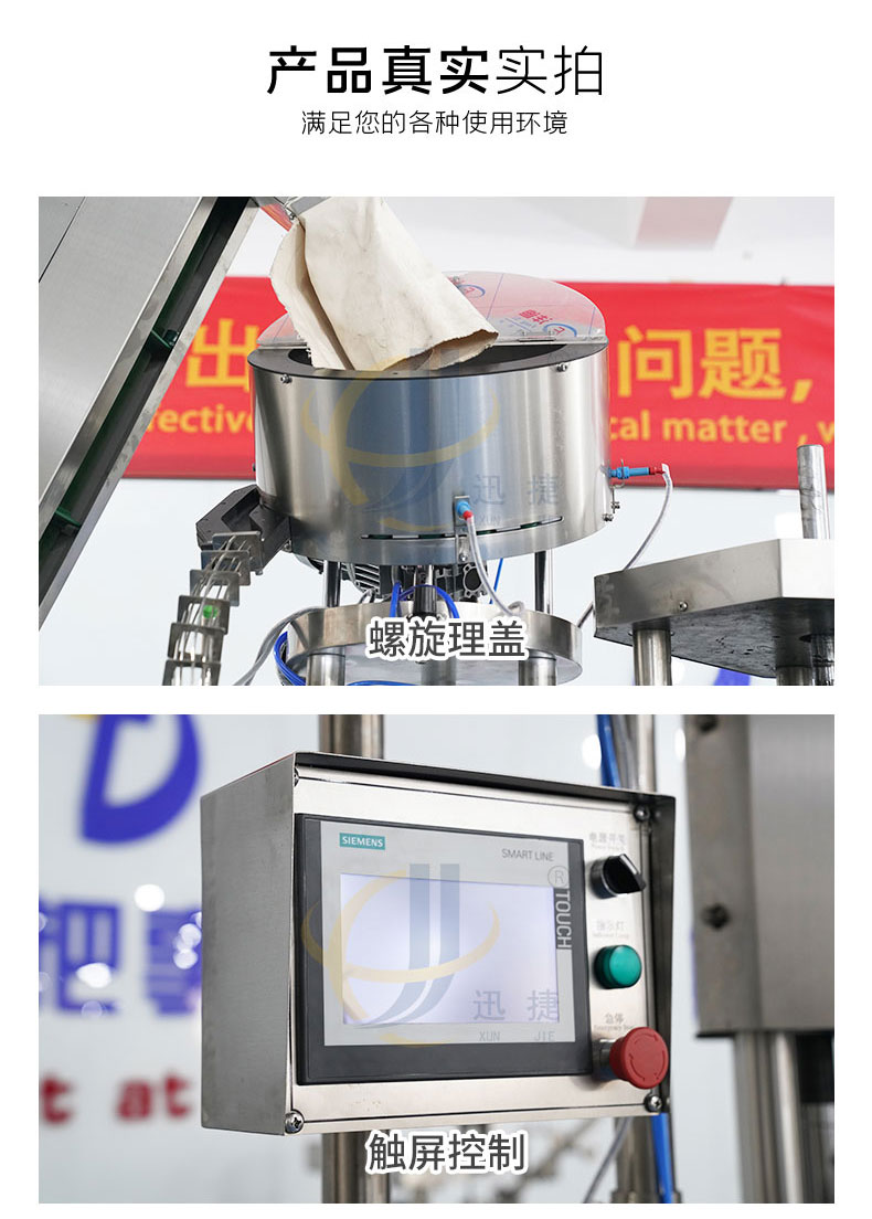 全自動(dòng)四頭金屬鎖蓋機(jī)供鋁蓋酒瓶瓶封蓋用,整體采用304不銹鋼制作,運(yùn)行穩(wěn)定可靠。適用于50-100ml各類(lèi)圓瓶、方瓶等瓶型旋蓋。