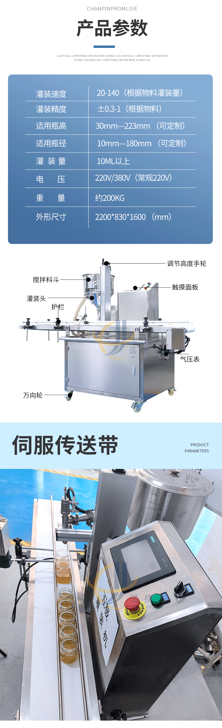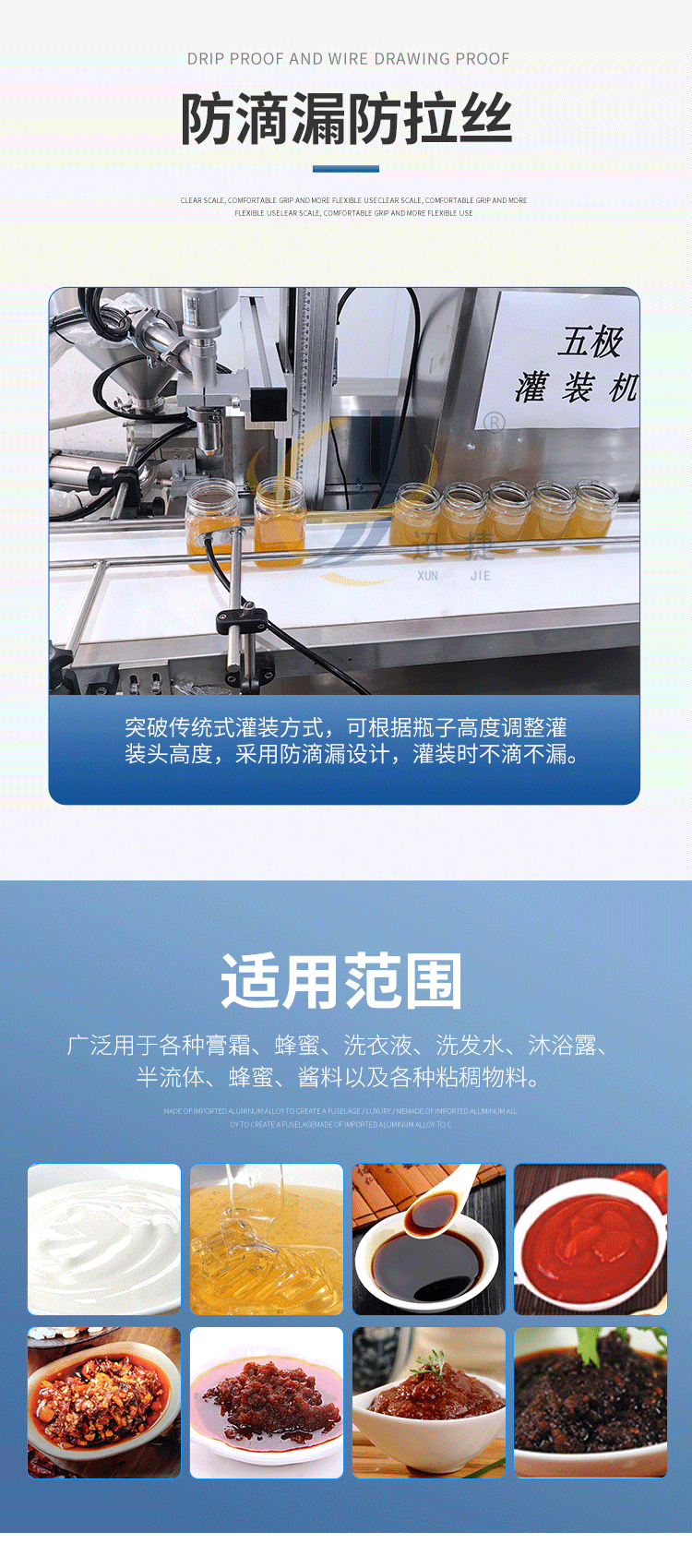 五極灌裝機:極快-單頭2200瓶/時 極簡-操作簡單 極廣-啥啥都能灌 極穩(wěn)-24小時不停機 極準(zhǔn)-200g誤差小于1g。它可以和真空旋蓋機搭配使用。
