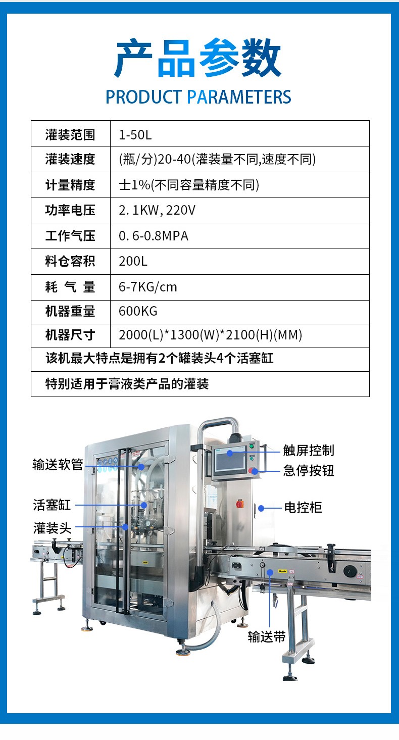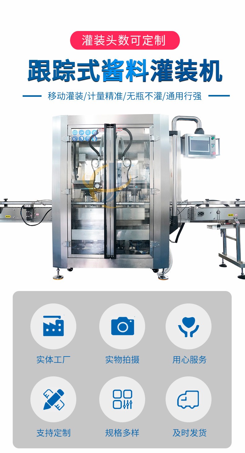 跟蹤式調味醬灌裝機設備配置定量灌裝、定液位灌裝兩種方式,計量誤差2克。定量灌裝保證每一瓶的灌裝質量。