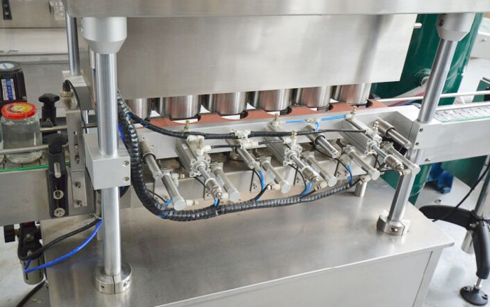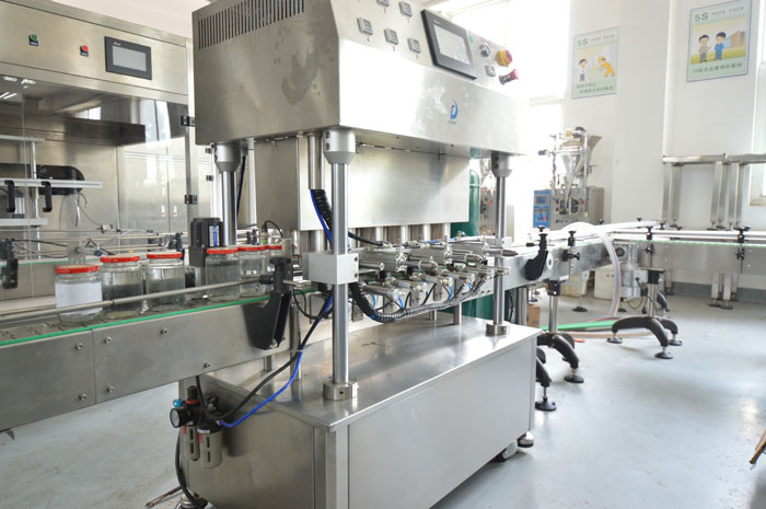 罐頭真空封蓋機(jī)用于調(diào)味品醬、水產(chǎn)罐頭、水果罐頭等采用目前環(huán)保的玻璃瓶包裝后對瓶內(nèi)真空度有比較高要求的三旋、四旋蓋的玻璃瓶進(jìn)行封蓋,本機(jī)配上真空系統(tǒng)后,能先對玻璃瓶內(nèi)進(jìn)行抽吸真空,然后再進(jìn)行旋蓋封口,以延長瓶內(nèi)容物的保質(zhì)期及增強(qiáng)口感,而且不用加熱以保持物料色澤不變。實行自動進(jìn)瓶、自動封蓋、自動進(jìn)行抽真空。
