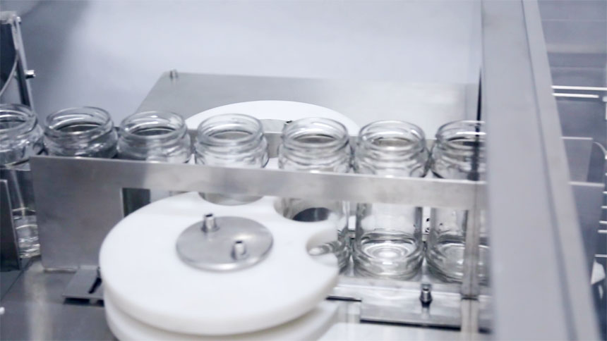設(shè)備介紹:醬類灌裝線配套廣口玻璃瓶洗瓶機(jī)具有性能可靠、操作簡單、清洗效果良好、工作效率高等特點(diǎn),主要由不銹鋼水泵、高壓噴頭、電器箱等組成。它的工作原理是先將需要清洗的瓶子裝進(jìn)瓶盤內(nèi),然后人工送入工位,通過循環(huán)水噴將需要清洗的瓶子注滿水沉至清洗槽先進(jìn)行簡單的粗洗。然后瓶子會上升推進(jìn)洗瓶機(jī)的第二工位,在第二工位會進(jìn)行三次仔細(xì)的清洗,在經(jīng)過三次氣沖、甩干,再自動進(jìn)入到滅菌烘箱。清洗過程為粗洗一次,仔細(xì)清洗三次,然后是烘干。