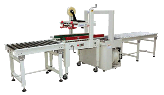 封箱機(jī)(紙箱膠帶封口)+高解析噴碼機(jī)(日期、批號(hào)、廠(chǎng)名等信息噴印打碼設(shè)備)+自動(dòng)打包機(jī)(自動(dòng)打出兩道PP帶。進(jìn)行紙箱捆扎包裝)